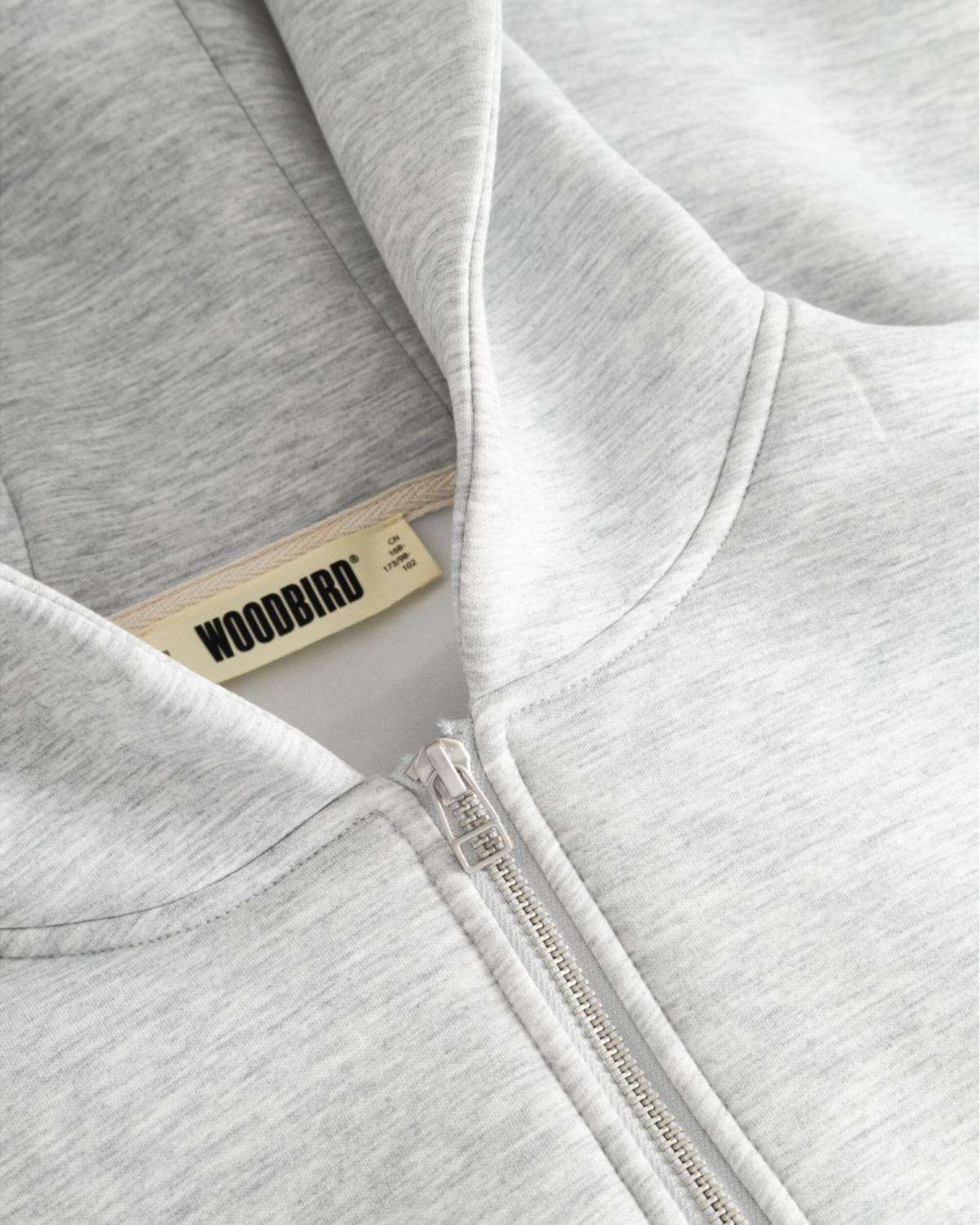 Fuji Scuba Zip Hoodie - Light Grey Melange fra Woodbird er en hverdagsven i Trøjer-kategorien. Blød scuba-kvalitet og afslappet pasform giver en behagelig følelse hele dagen, og hætte med gennemgående lynlås gør den nem at bruge over en tee eller under en jakke, alt efter vejr og humør.