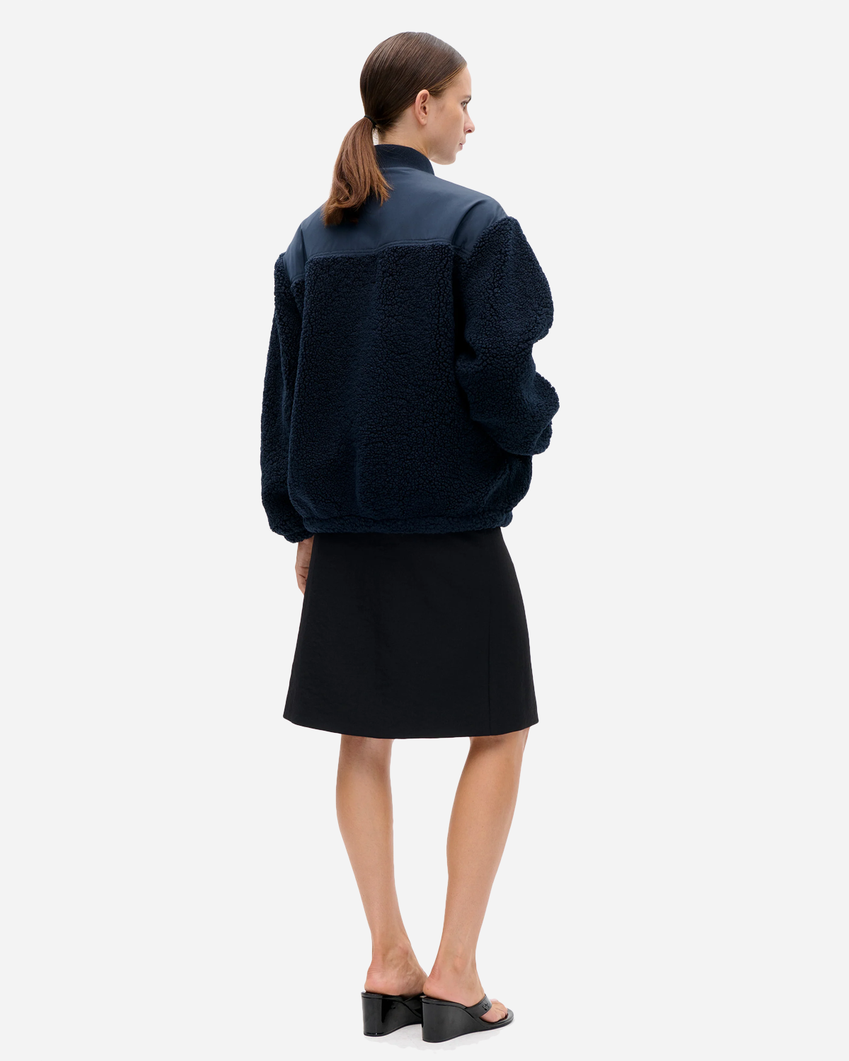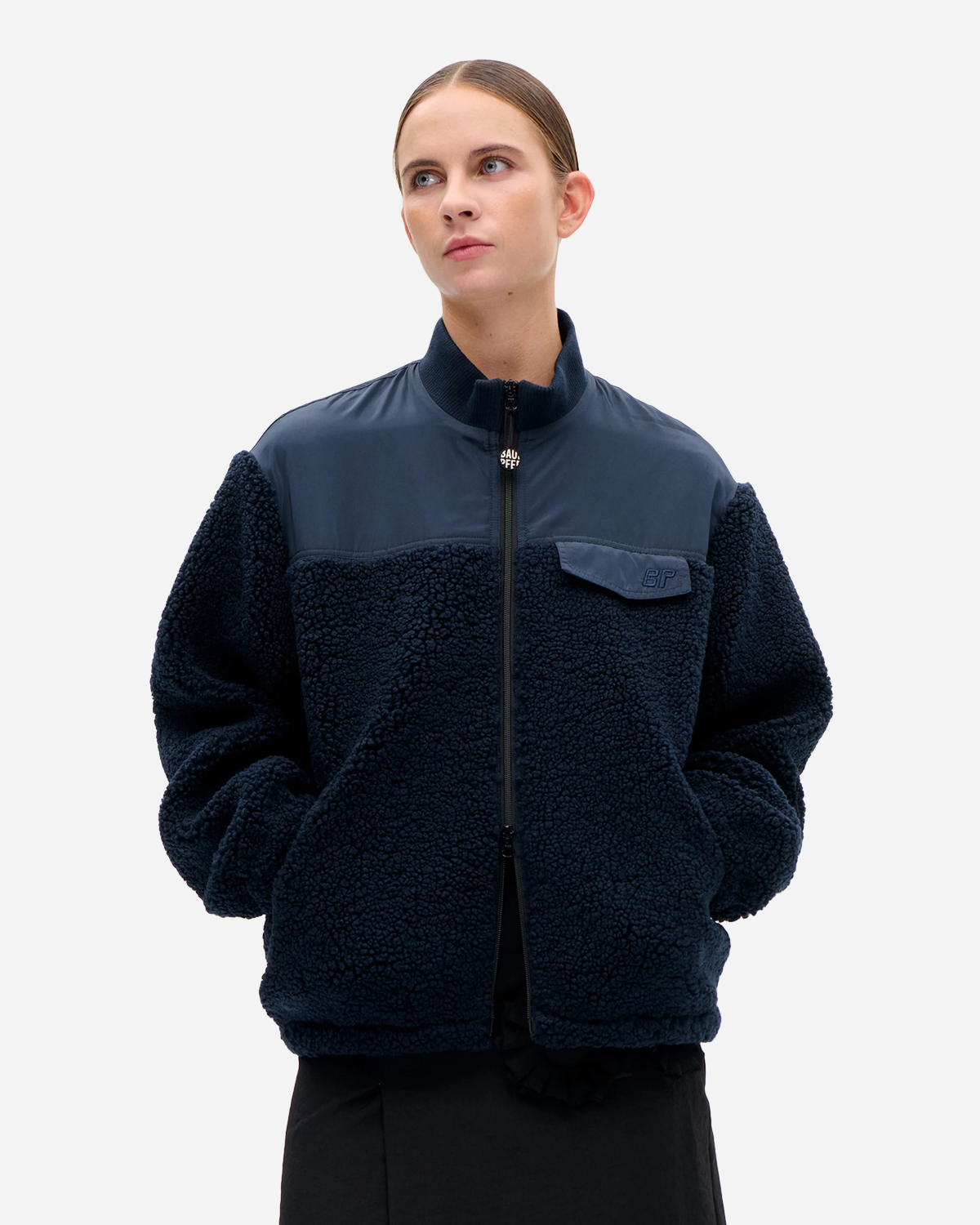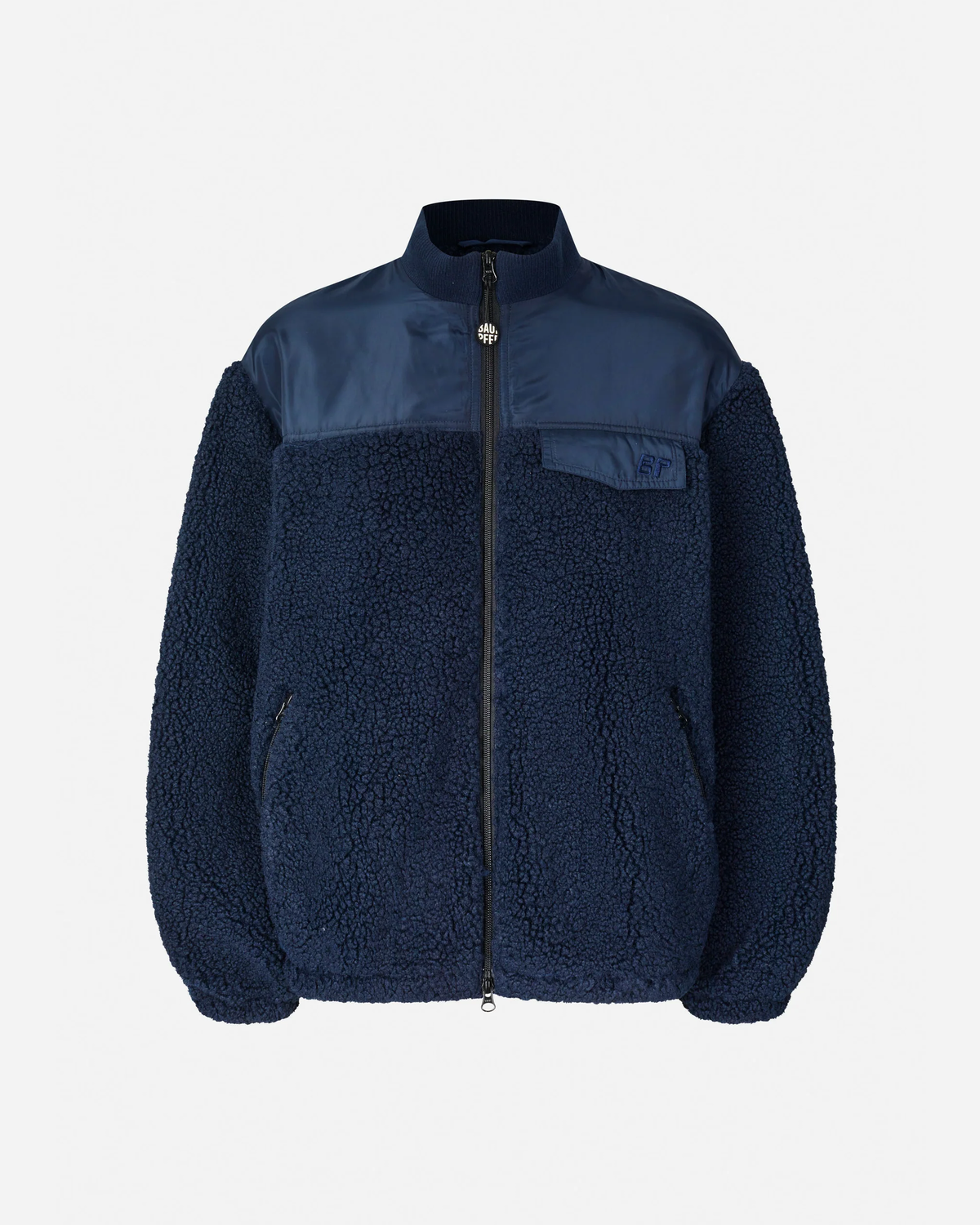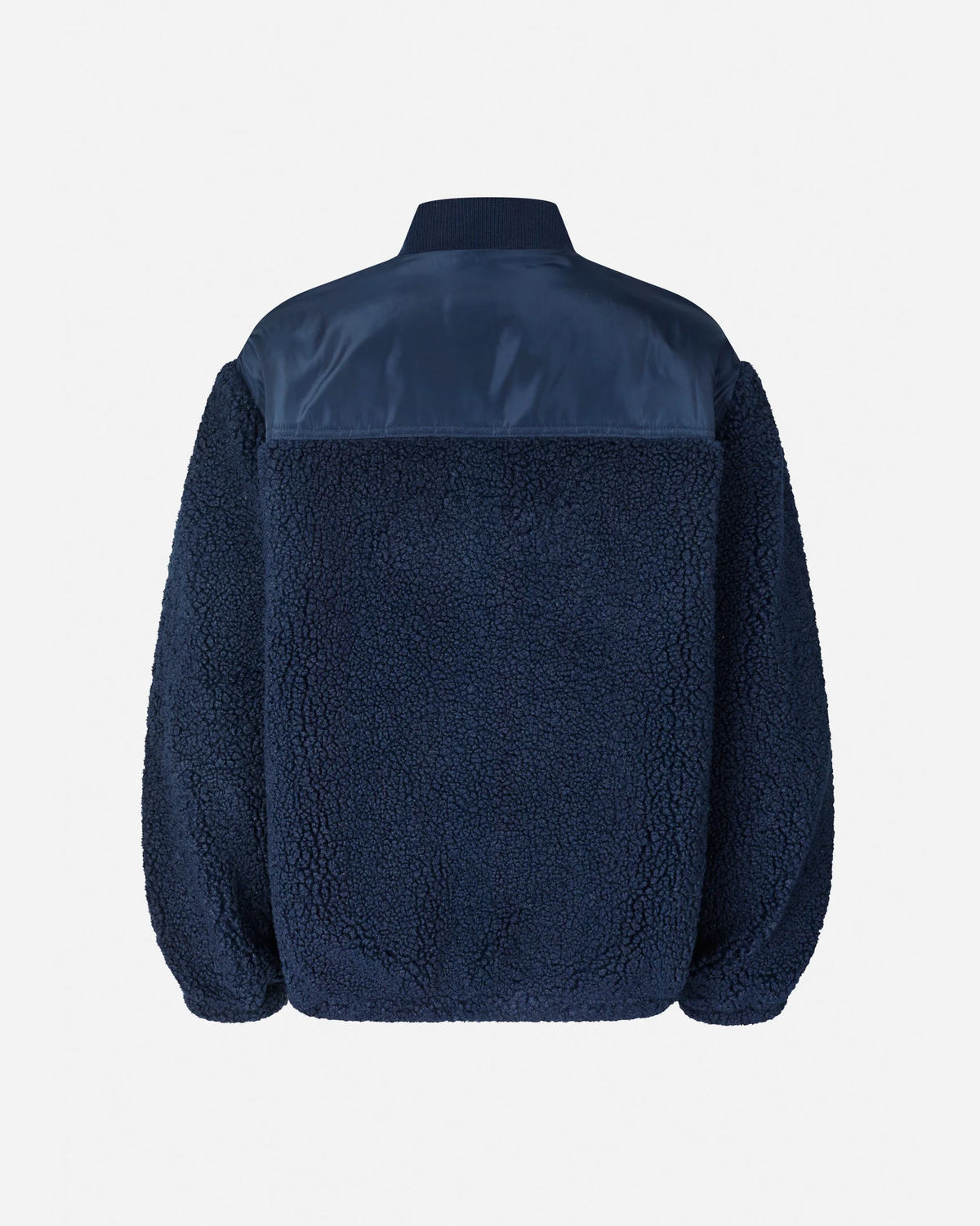 Baum und Pferdgarten Jeya - Baritone Blue er en jakke i blød fleece med genanvendt polyester, lavet i en løs pasform. Den har sænkede skuldre og en ribbet, opretstående krave, som giver en afslappet silhuet uden at blive for sporty.