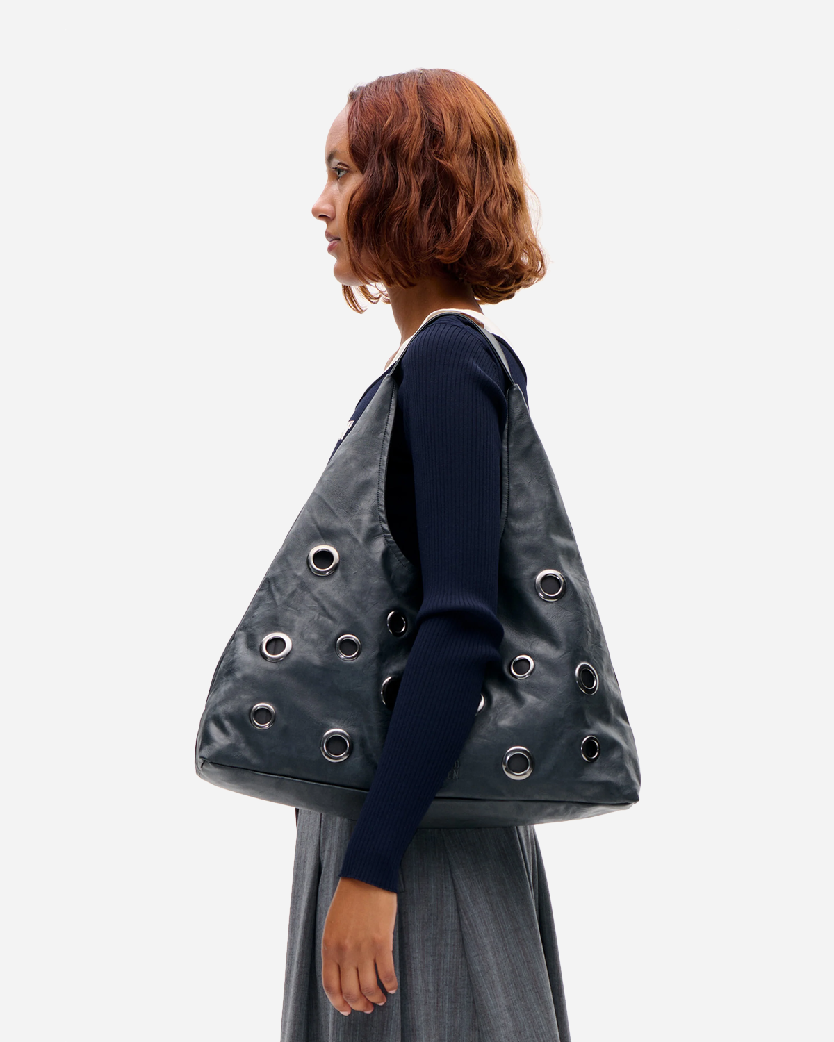Kleola - Dark Navy fra Baum und Pferdgarten lander solidt i vores kategori Tasker & Punge som en nem hverdagstaske med plads og ro i designet. Den er lavet i blød imiteret ruskind med en rummelig silhuet, så den er lige til at bruge på arbejde og i weekenden. De markante metaløjer og det diskrete tone i tone logo giver et rent, grafisk look, der er let at style.