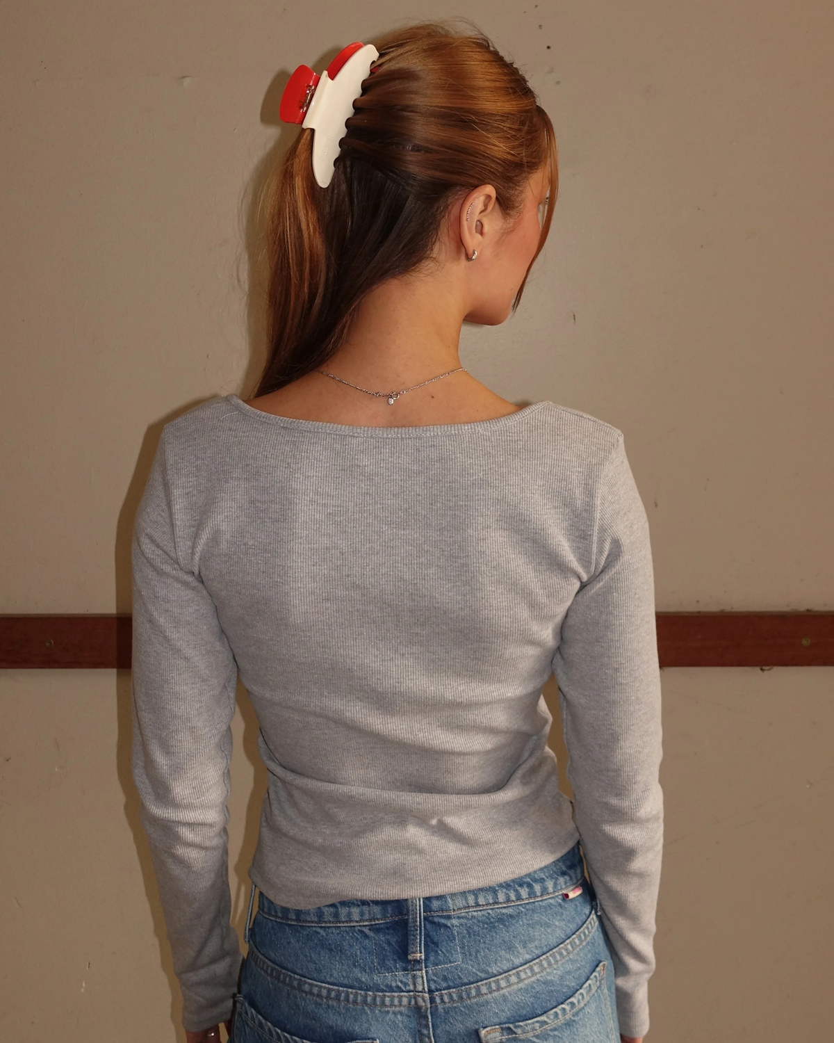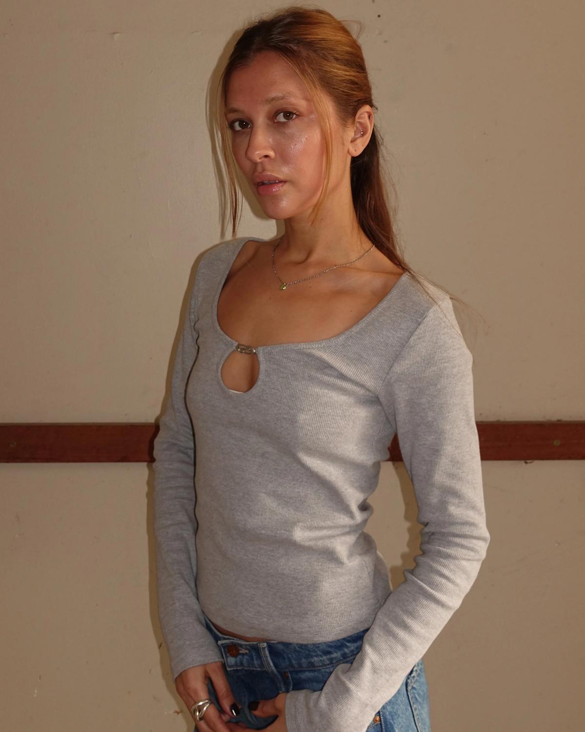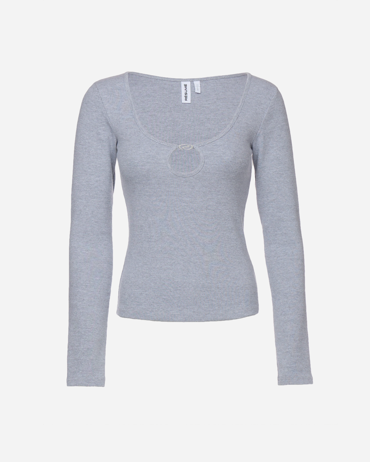 LucyRS Blouse - Grey Melange fra Résumé er en tætsiddende ribbluse med lange ærmer, der smyger sig pænt om kroppen. Den føles som en figursyet T-shirt, bare med den ekstra struktur fra ribstrikken.