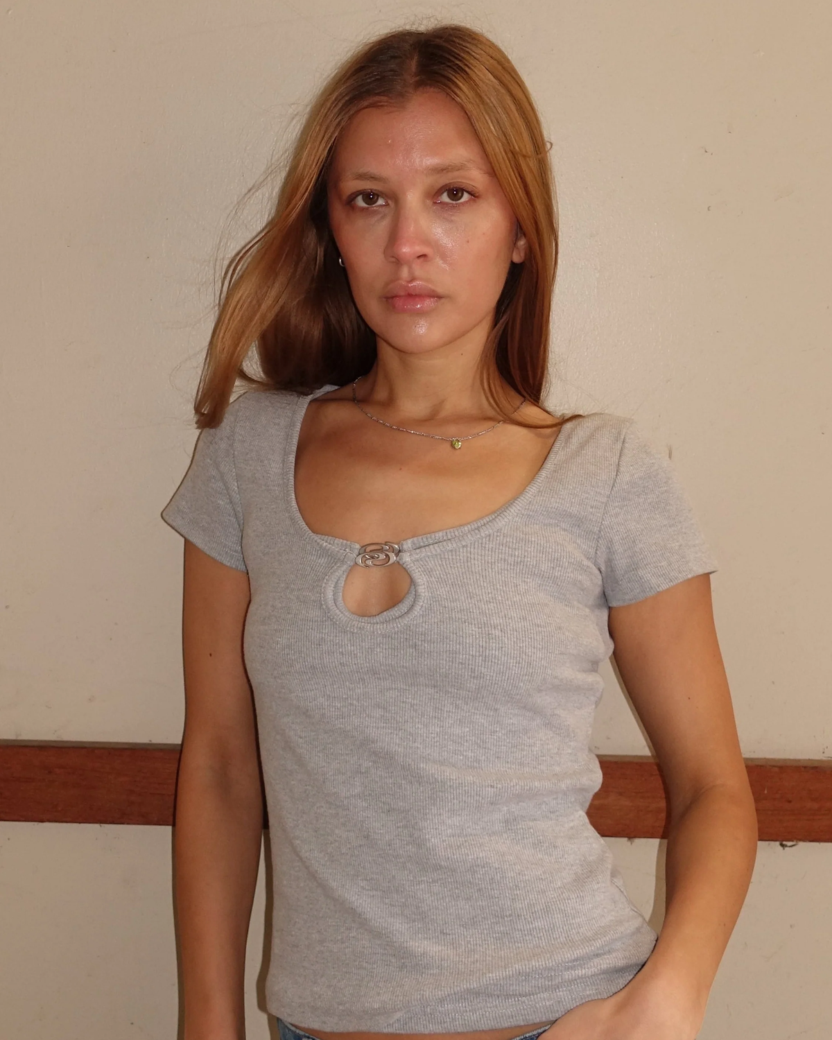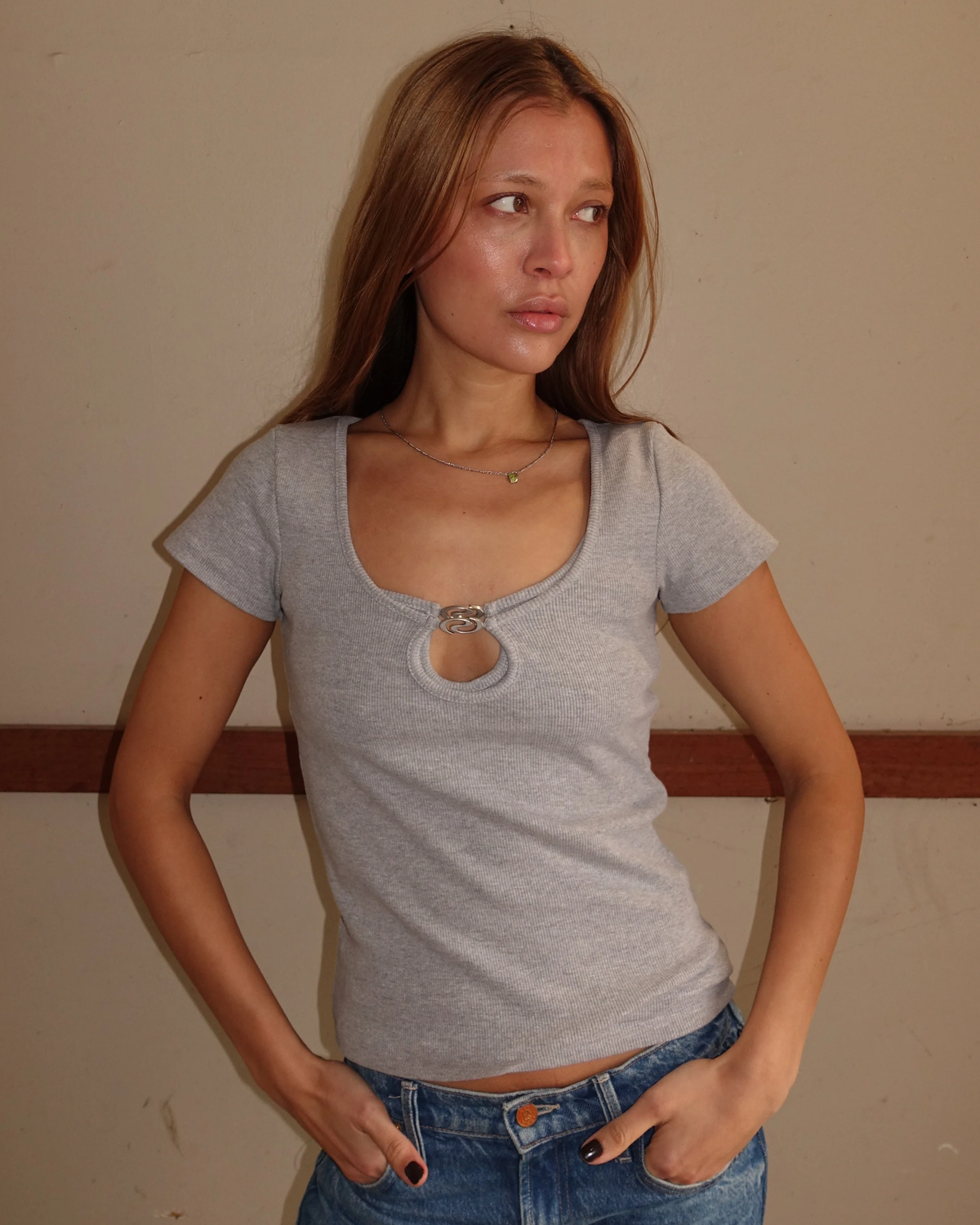 LucyRS Tee - Grey Melange fra Résumé er en ribbet T-shirt med tæt pasform og masser af stretch. Den lægger sig pænt ind til kroppen og giver en markeret silhuet. Stoffet er blødt i 95 procent bomuld og 5 procent elastan, så du får både komfort og bevægelse.