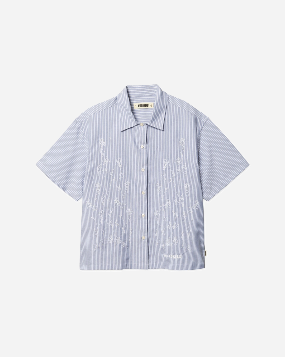 Luna Ox Flower Shirt - Blue Stripe fra Woodbird blander fine blomster med blå striber for et friskt og stilrent look. Skjorten har gennemgående knaplukning, klassisk krave og korte ærmer, så den er nem at bruge i hverdagen.