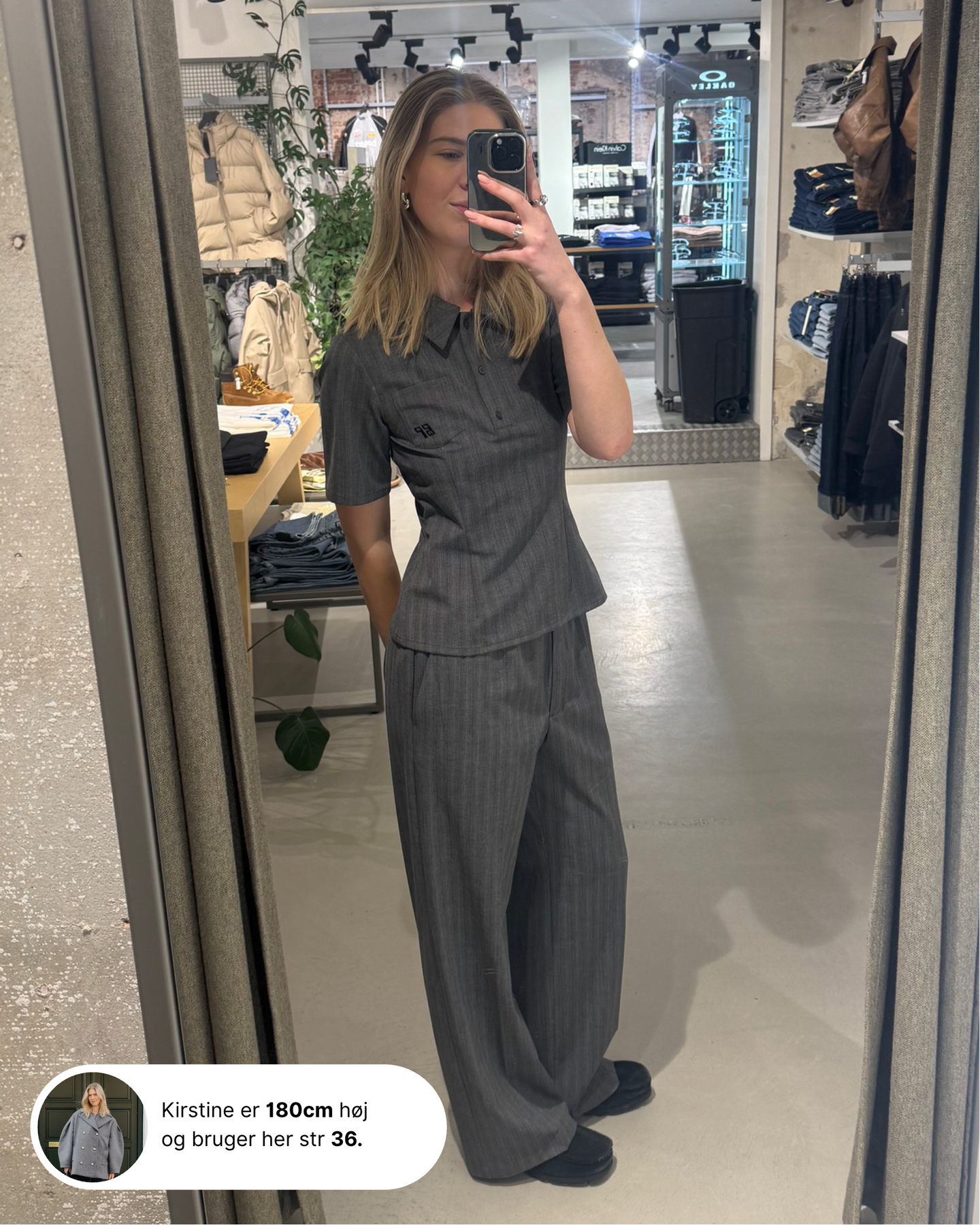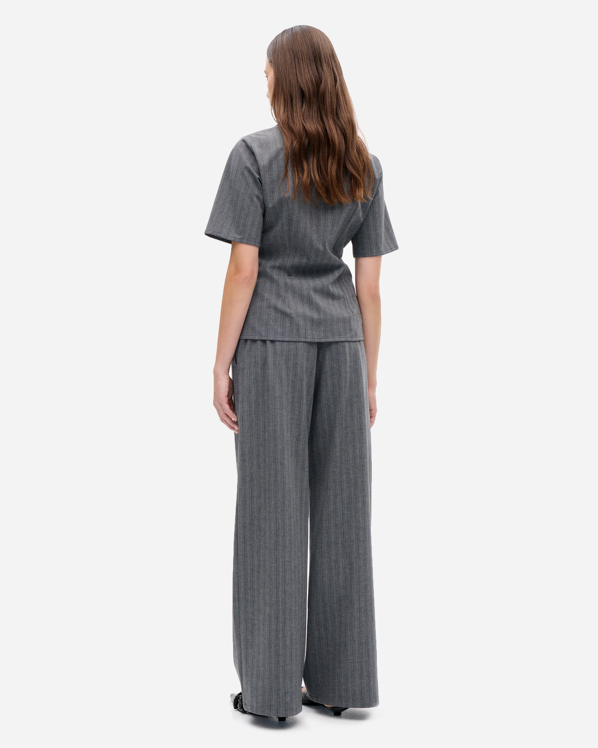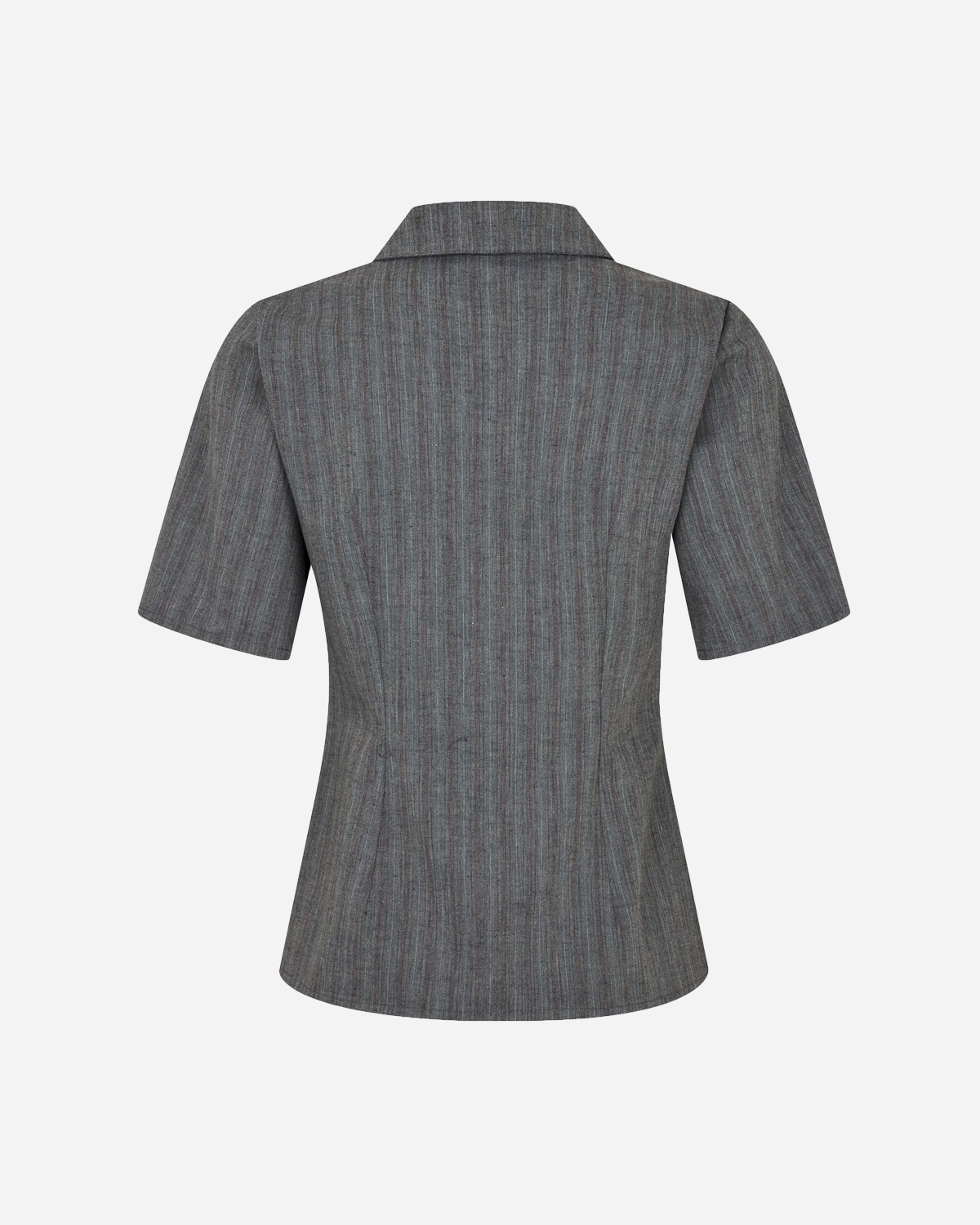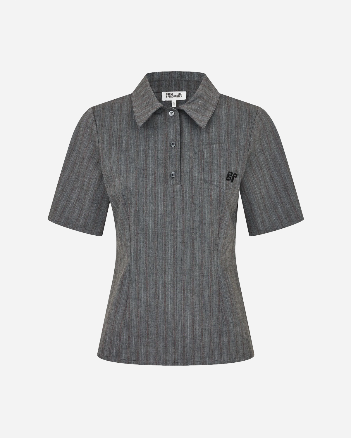 Merida - Grey Stripes fra Baum und Pferdgarten tager den klassiske skjorte og giver den rolig struktur: de grå striber ligger på en blød, vævet fiskebensstruktur, som giver dybde uden at larme. Materialet er en behagelig blanding af 68% genanvendt polyester, 27% uld og 5% spandex, så du får let varme, lidt stræk og en form, der holder.