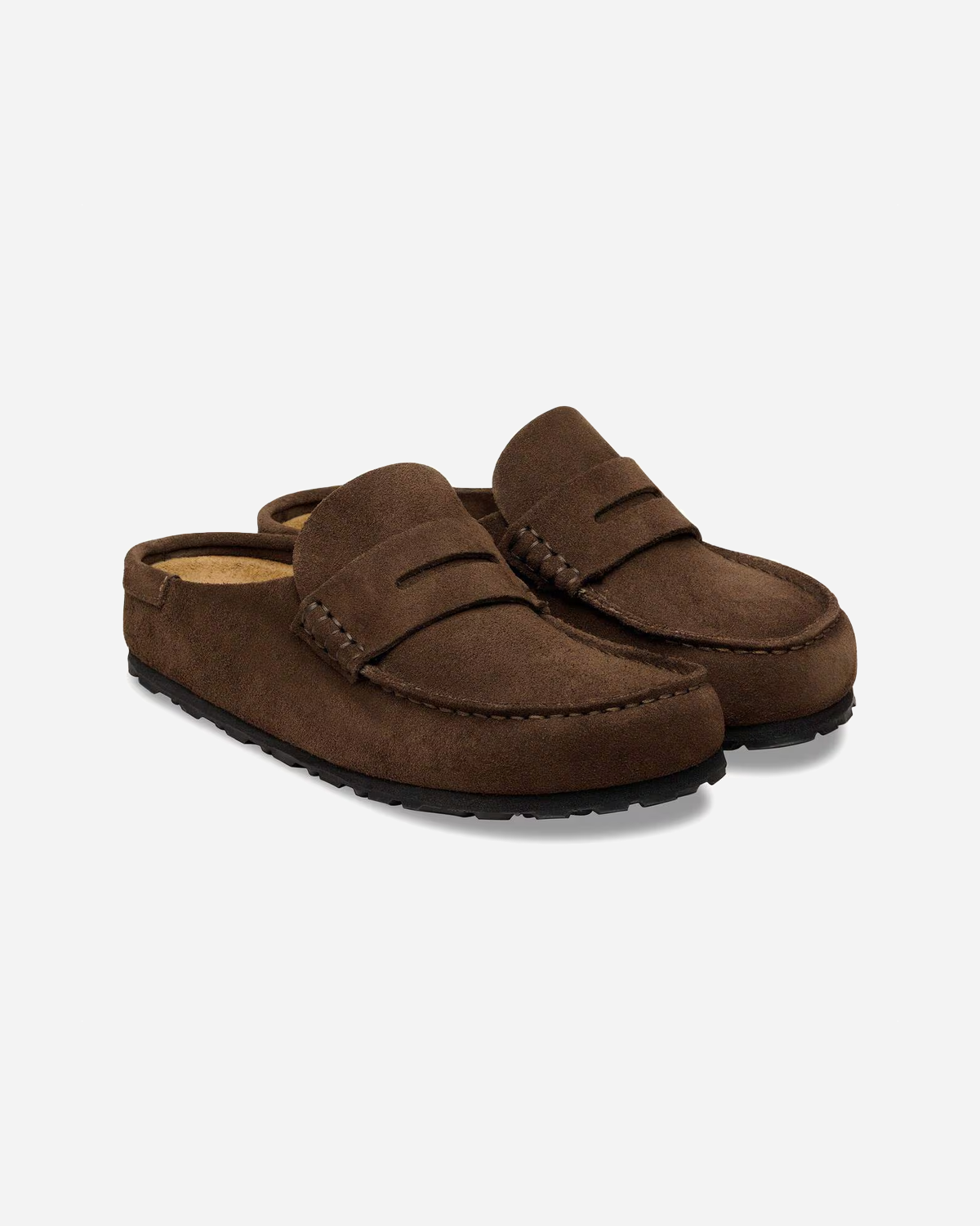 Birkenstock Naples Wrapped - Carafe er en unisex clog i ruskind, der læner sig mod loafer og moccasin. De markante syninger, den lille tungedetalje og den ruskindsindpakkede mellemsål giver et roligt, samlet look, som fungerer lige godt på kontoret og senere på dagen. Carafe er en dyb brun farve, der spiller fint sammen med både jeans, chinos og mere afslappede bukser.