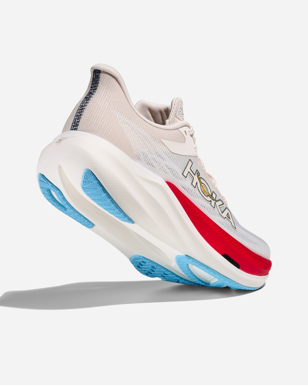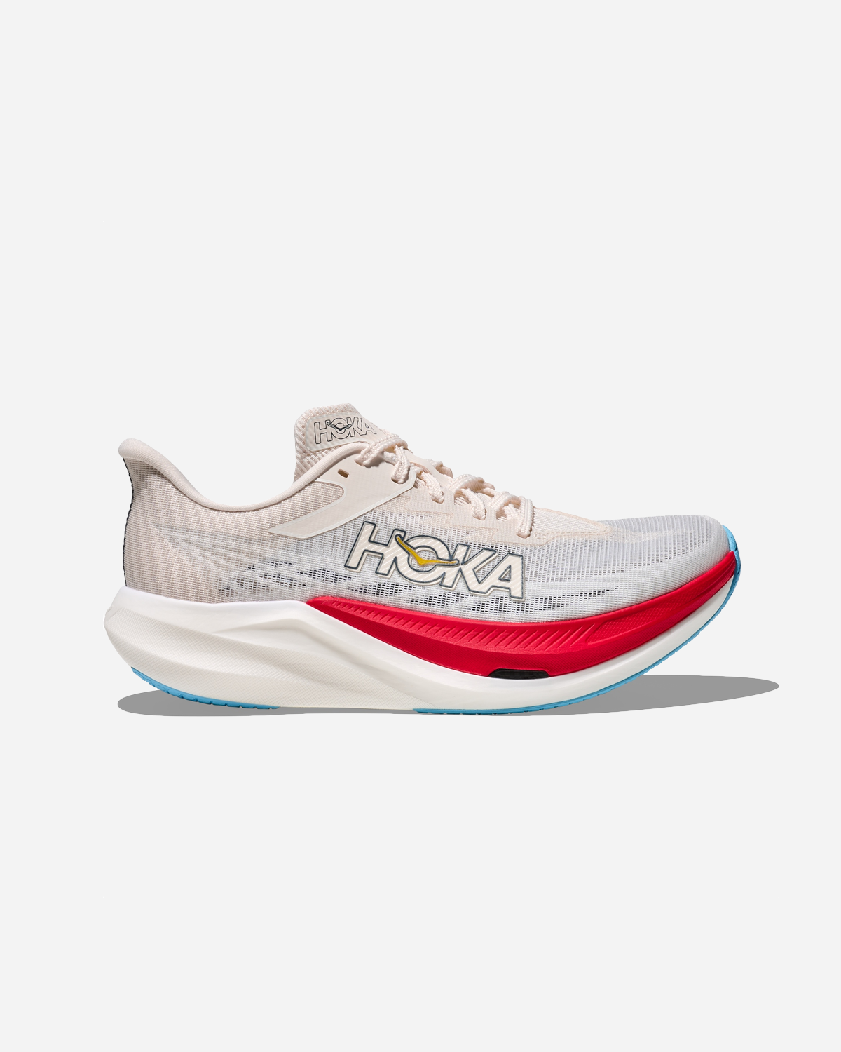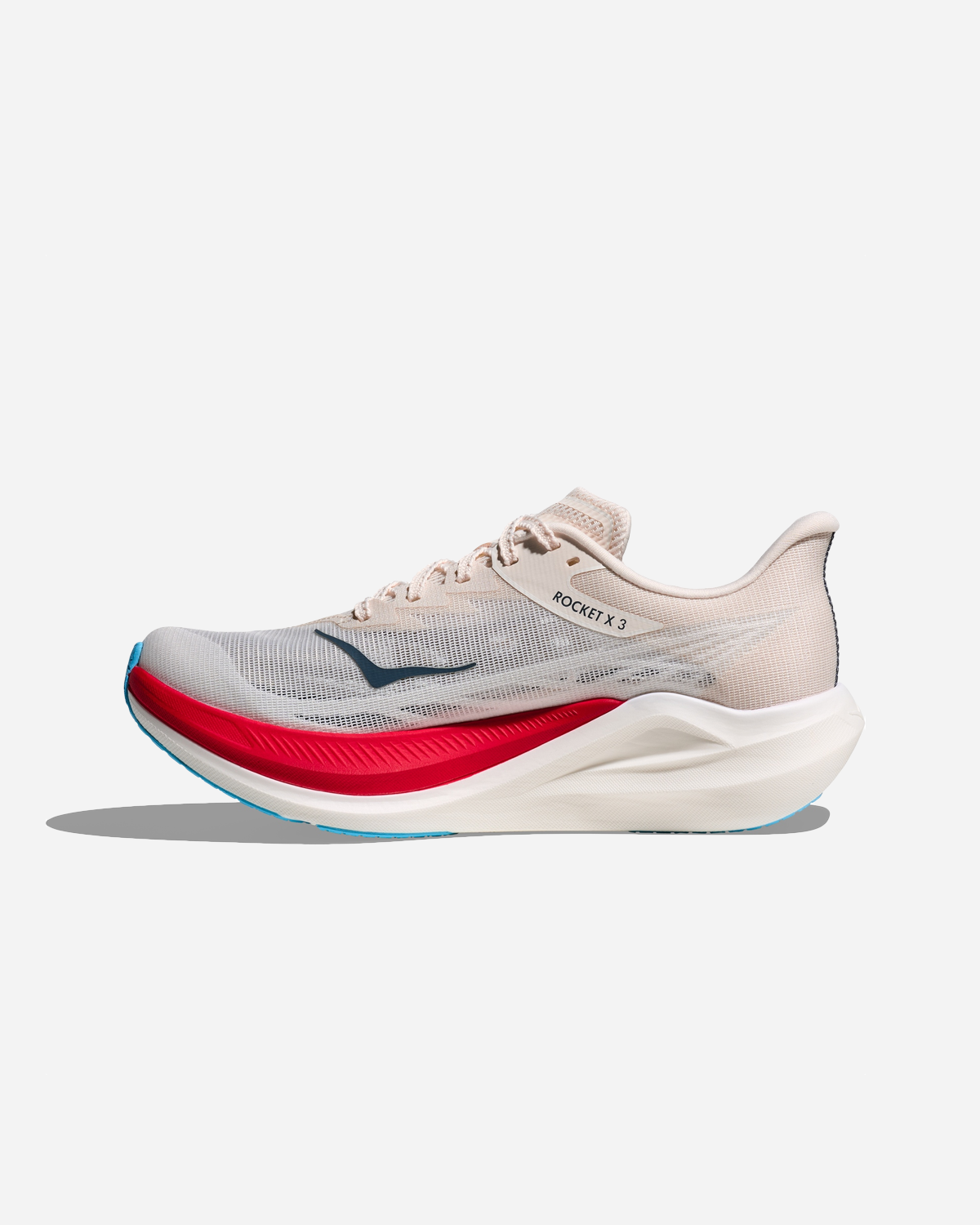 Hoka Rocket X 3 Unisex - Alabaster / Frost er en let løbesko til alt fra 5 km til marathon. Skoen kombinerer en kulfiberplade med PEBA-skum i to hårdheder, så afsættet føles hurtigt og stabilt. Den høje dæmpning og et 7 mm drop hjælper dig med at holde et behageligt tempo, også når distancen bliver lang.