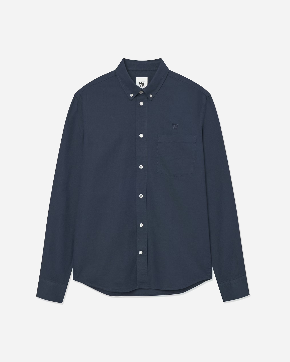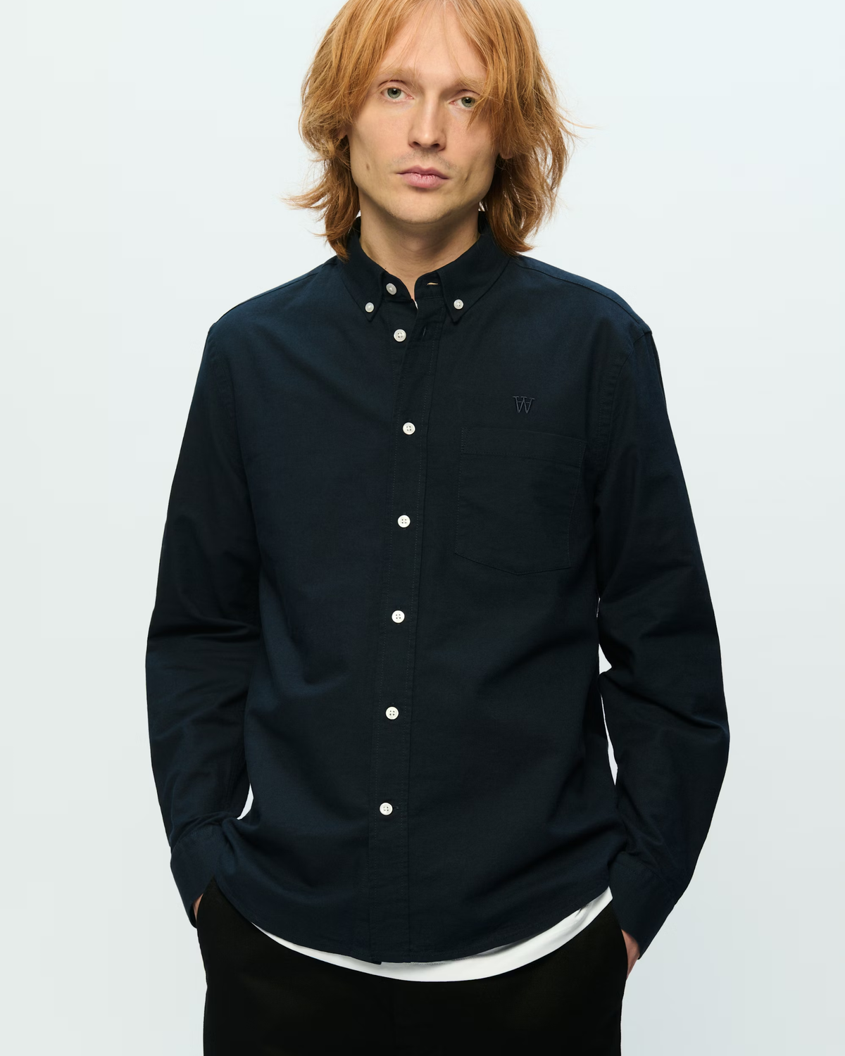 WWAdam - Outer Space fra Double A by W.W. er Wood Woods bud på en Oxford-skjorte, der rammer en behagelig balance mellem pænt og afslappet. Farven Outer Space er dyb og nem at bruge i garderoben, så skjorten spiller godt til både jeans, chinos og dage på kontoret.