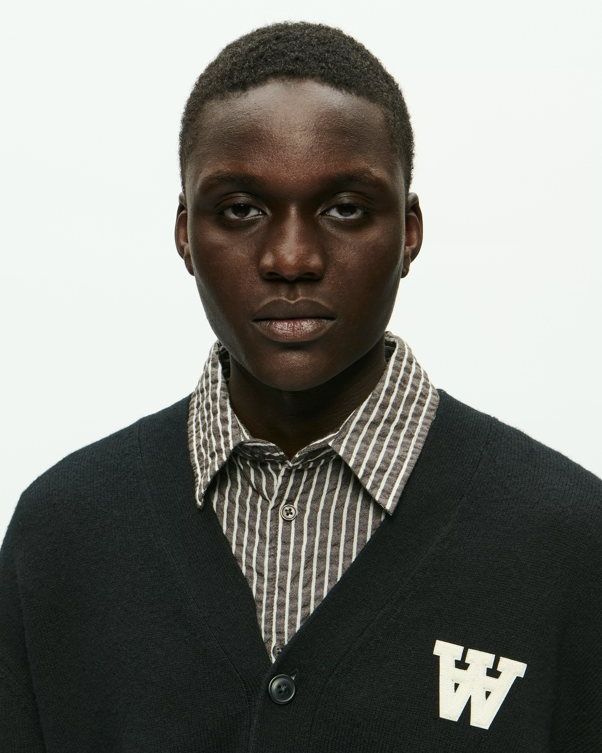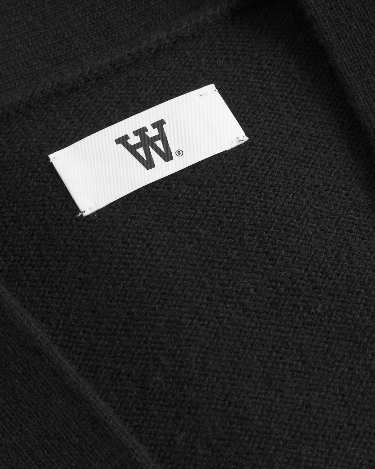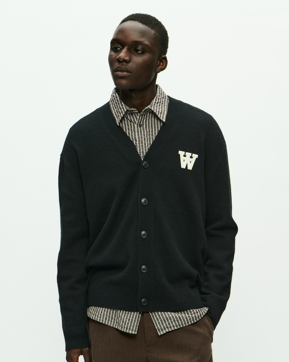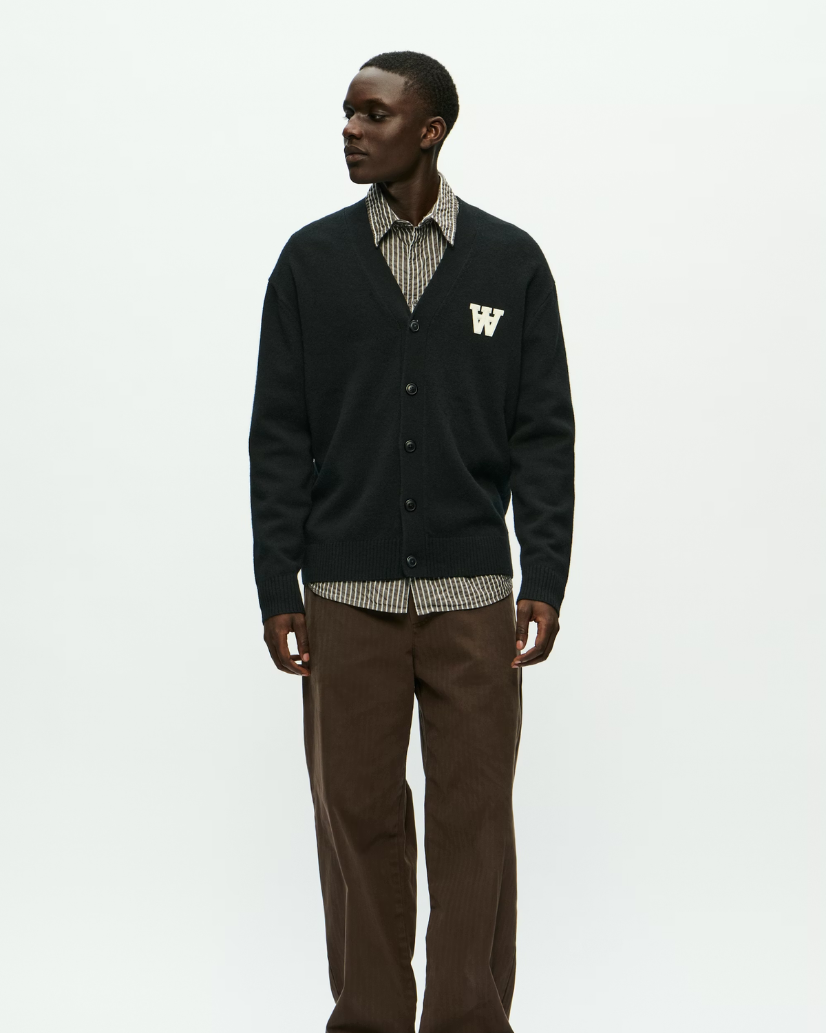 WWTay Cardigan - Black fra Wood Wood, Double A by W.W., er en sort herrecardigan i strikket 100% lammeuld. Klassisk pasform, V-hals, lange ærmer og knapper foran. Den lille brodering på brystet holder det enkelt og pænt.