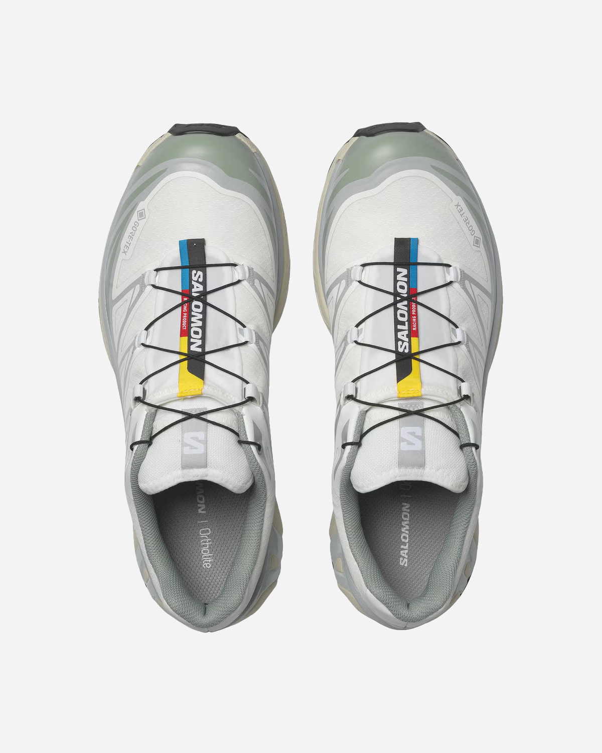 Salomon XT-6 GTX - White / Green Milieu / Ice Flow er lavet til skiftende vejr og blandet terræn. GORE-TEX-membranen holder vandet ude og lader foden ånde, mens Mud Contagrip-ydersålen giver sikkert greb på både våde fliser og ujævne stier.